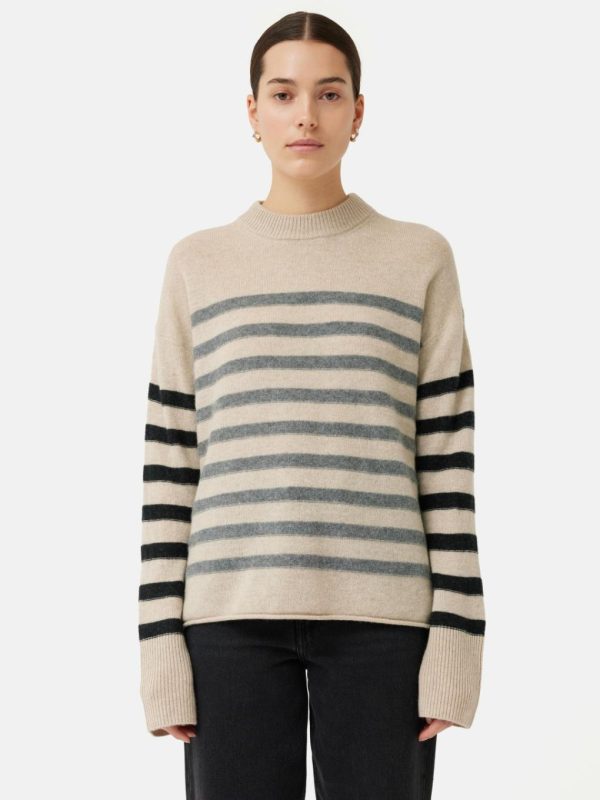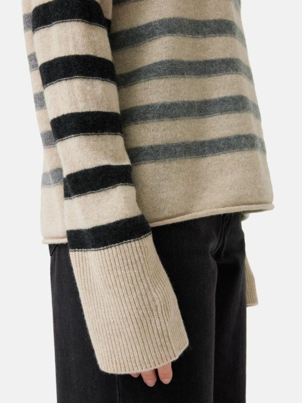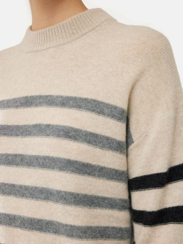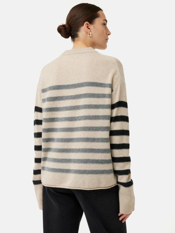 With its nautical stripes and a sumptuous blend of merino and cashmere yarn, this jumper meets all the criteria. The ribbed cuffs and neckline offer a structured, refined fit, while the understated rolled hem relaxes the silhouette. Designed with a regular fit, it effortlessly slips under coats and outer layers, ensuring both comfort and style.Fit and Features
