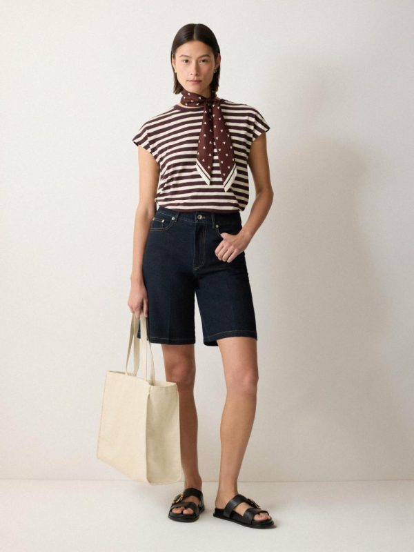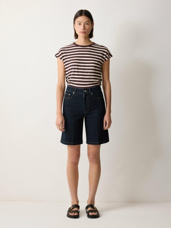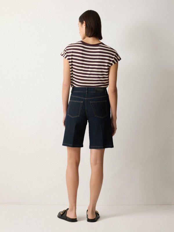 The Bermuda short is quickly becoming a summer wardrobe staple across denim and linen. This dark indigo pair are cut for a flattering high-rise waist in responsibly-sourced cotton with classic 5-pocket styling. Add a stripe tee, printed scarf and slides for a laidback Parisian look.
