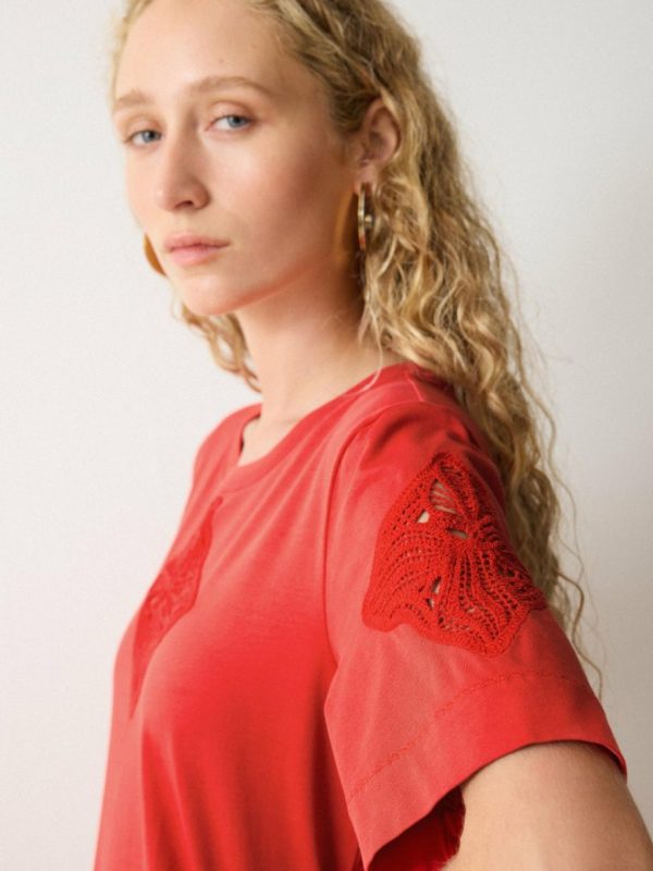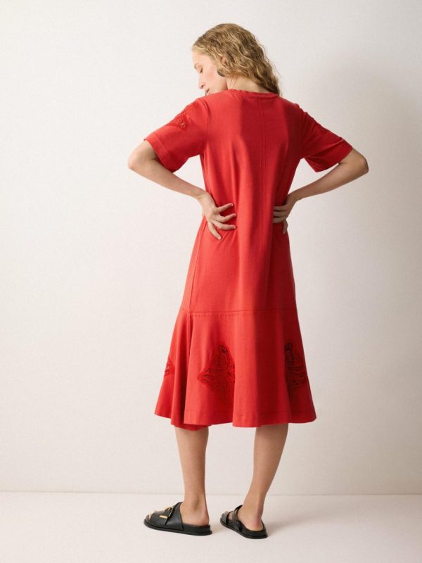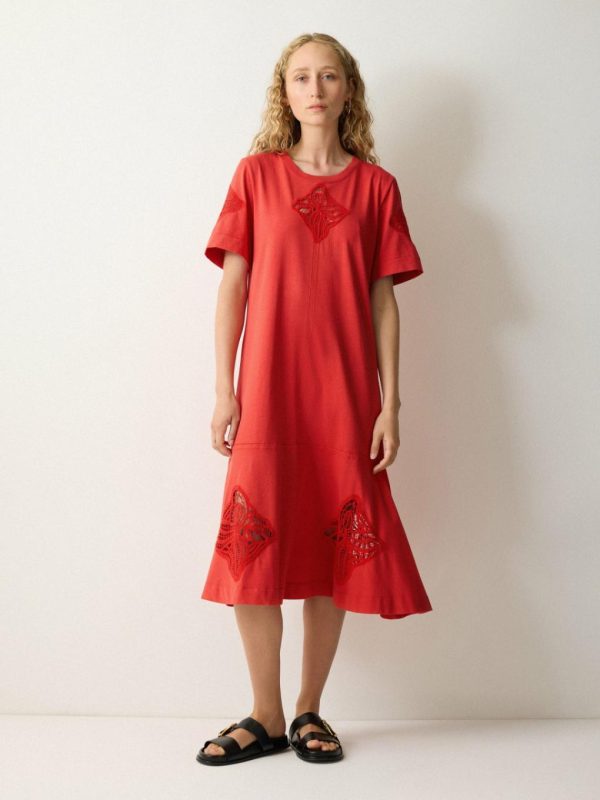 The T-shirt dress is given a summer-ready spin with this midi-length design in a sunbaked shade of red. Detailed with diamond crochet patches to the front, sleeves and hem lends an artisanal feel that’s perfect for endless days in the sun.