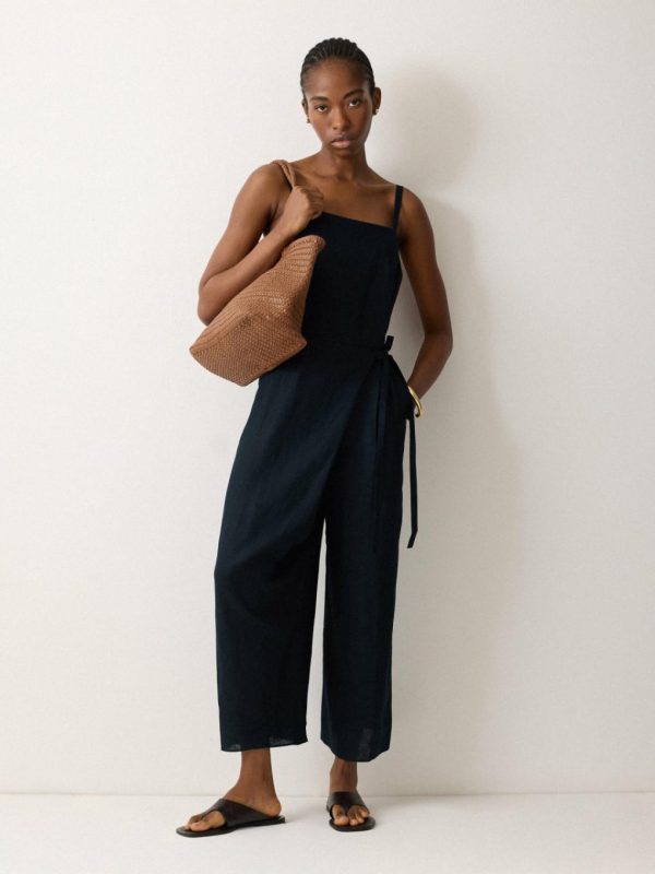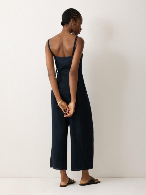 Flattering from every angle, this jumpsuit in deep indigo blue features a high square neck bodice with adjustable straps for the perfect fit. A self-tie belt creates a cinched-in waist, descending into a wide, cropped leg silhouette for subtle yet dramatic effect.
