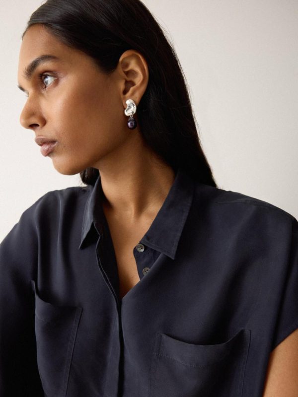 Inspired by organic sculptural formations, these stud earrings feature a bespoke molten texture design in sterling silver plating, accentuated by a single iridescent black pearl drop.