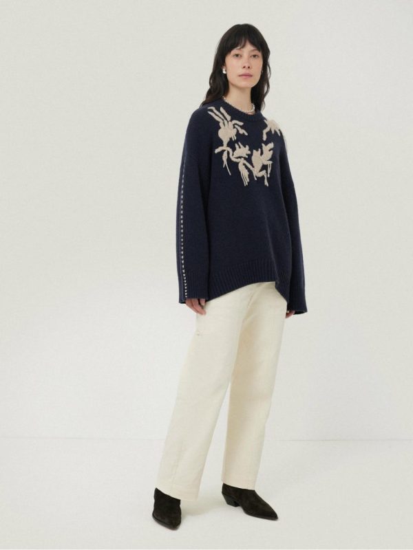 This season, we’ve added more feminine elements to our knitwear, drawing inspiration from this season’s prints. This navy jumper has been crafted from soft wool and showcases bold, hand-embroidered floral motifs to stand out against the ink blue backdrop, while contrasting chunky embroidery stitch lines add extra texture and a deconstructed, raw-edge feel. Its slouchy, longer-line silhouette enhances the sense of ease and comfort, making it a perfect blend of relaxed style and detailed craftsmanship.