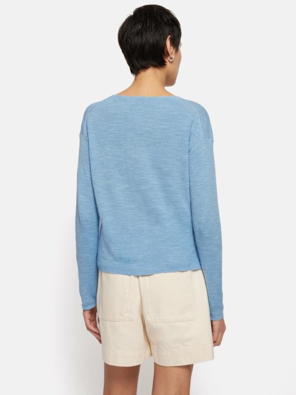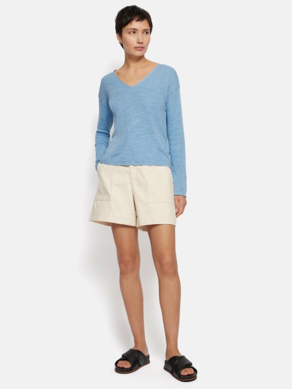 Invest in our fine gauge linen cotton knit V-neck jumper. This simplistic style features tiny rolled knit edges and a fine centre seam detail. Designed with a slim fitting shape, this jumper has a minimal aesthetic and lends itself as the foundation to your transeasonal ensembles.