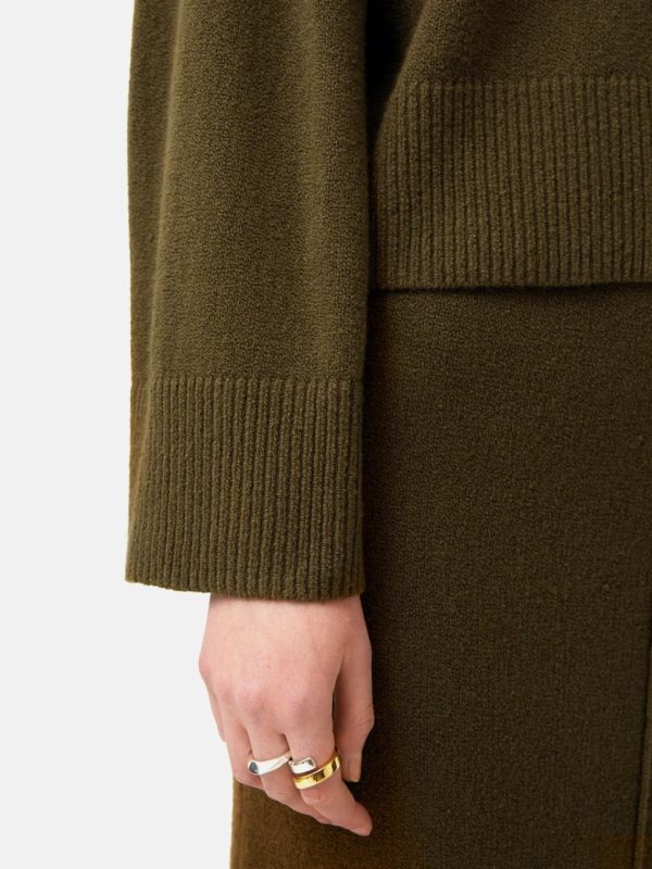 Fashioned from a sumptuous blend of yarns, this jumper features a boxy fit and subtly flared sleeves. It effortlessly pairs with a coordinating knit skirt, creating a seamless and versatile ensemble suitable for any season, encouraging mix-and-match possibilities.
