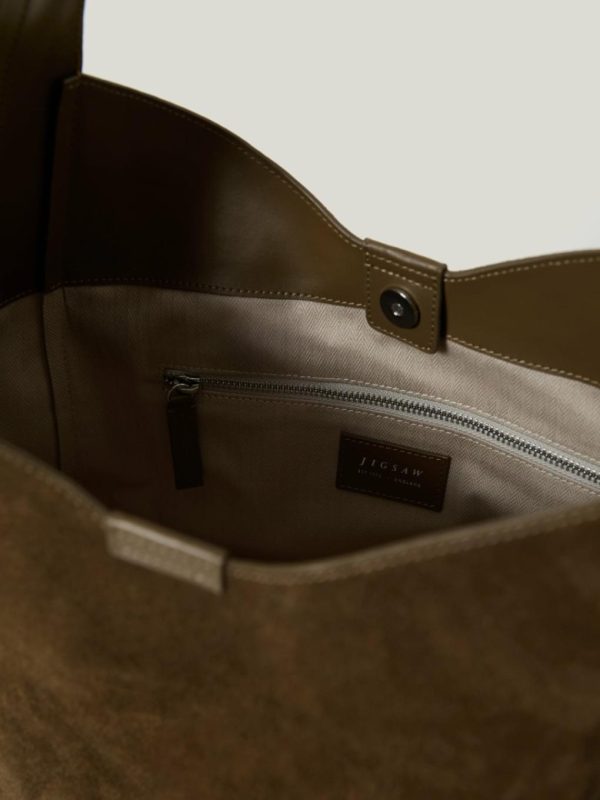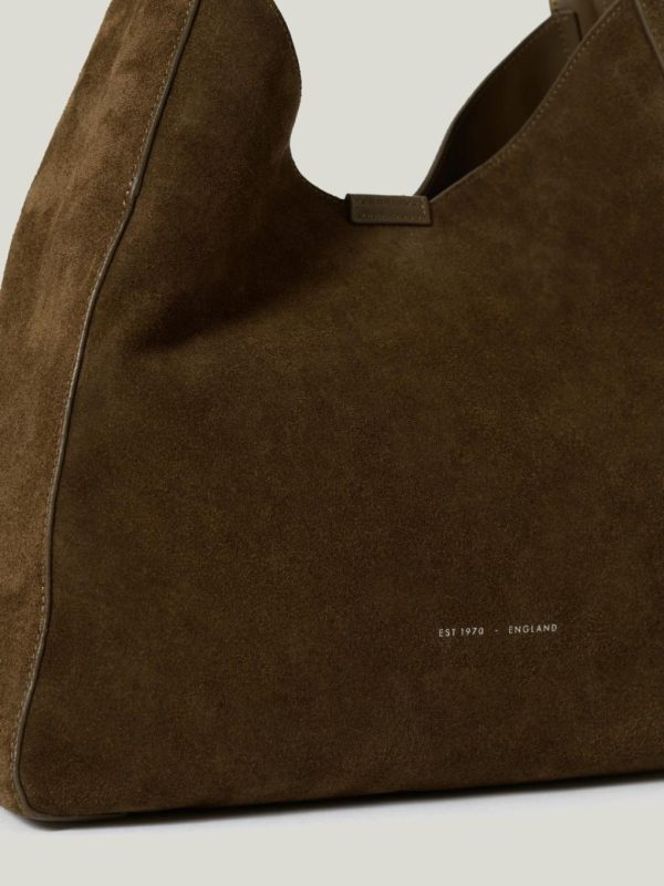 A soft slouch bag made from suede leather with a full cotton fabric lining. This roomy style has a magnet closure, internal zipped back pocket and flat front facing pocket for easy access. Metal feet on the base to prevent the suede from getting dirty.
