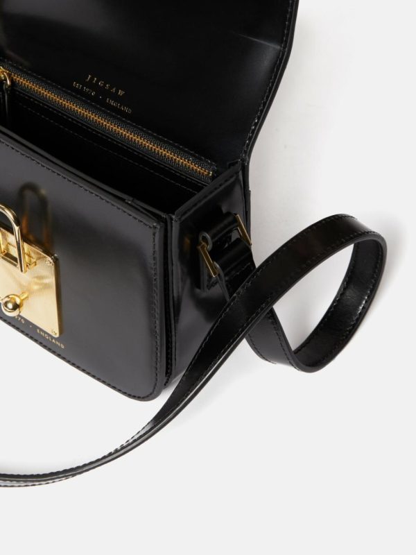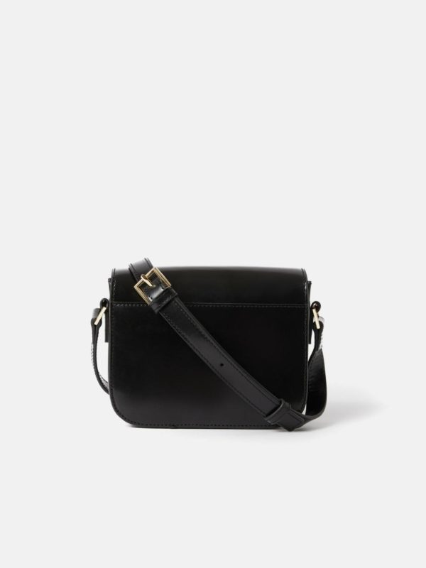 A small saddlery inspired crossbody in black with bespoke moulded gold hardware. Constructed from a durable glossy veg tanned leather with internal slip and zip pockets.Fit and Features