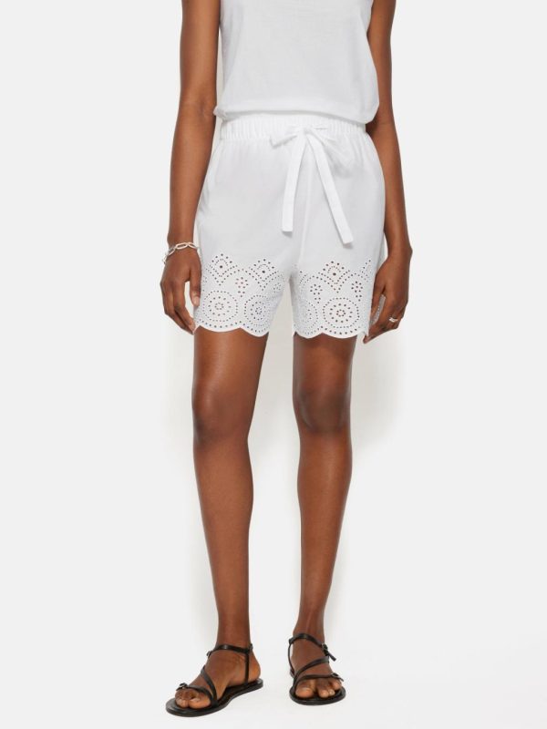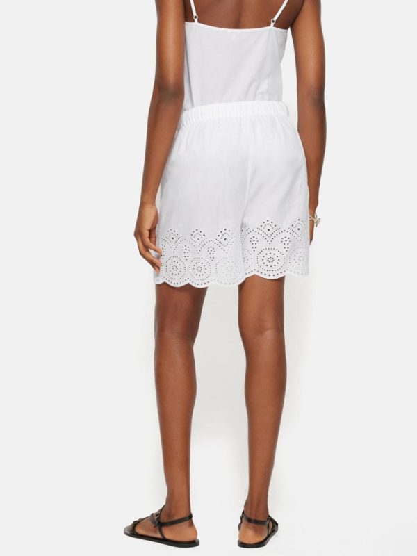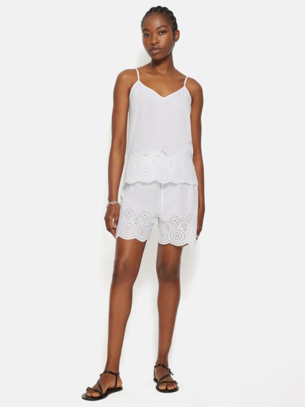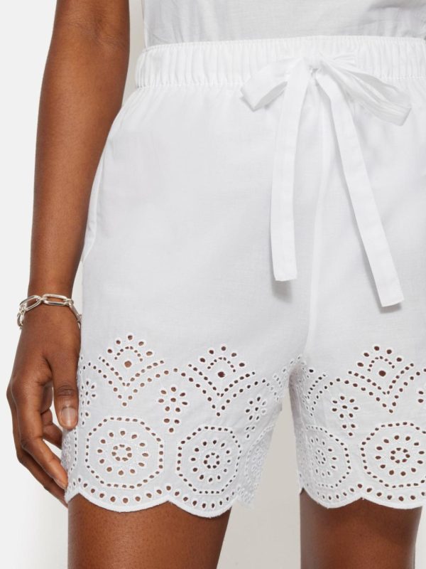 A decorative broderie anglaise trim and scalloped edging adds subtle femininity to these white pyjama shorts. Lightweight cotton keeps you cool as you sleep with an elasticated self-tie waist for comfort through the night. Designed to be mixed and matched with our other Broderie Anglaise pyjama pieces.