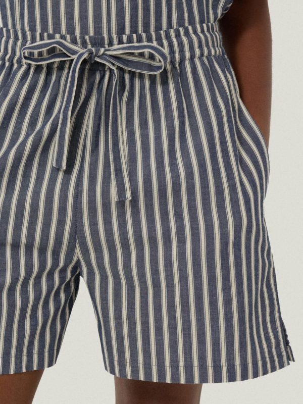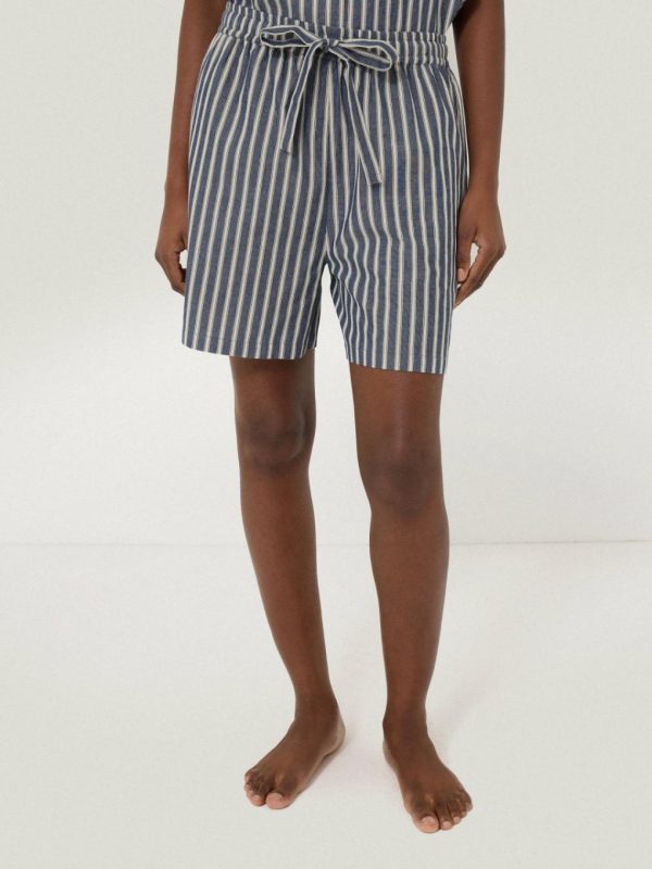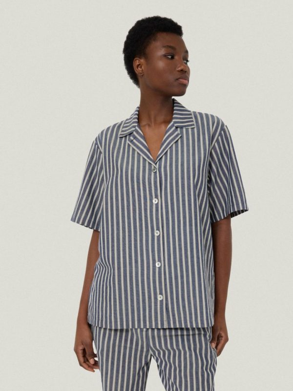 A classic pyjama style, this navy blue set features a timeless ecru ticking stripe pattern throughout on a super-soft woven cotton. Featuring a collared short sleeve shirt and shorts, this is the perfect pair for lazy mornings and weekend lounging.
