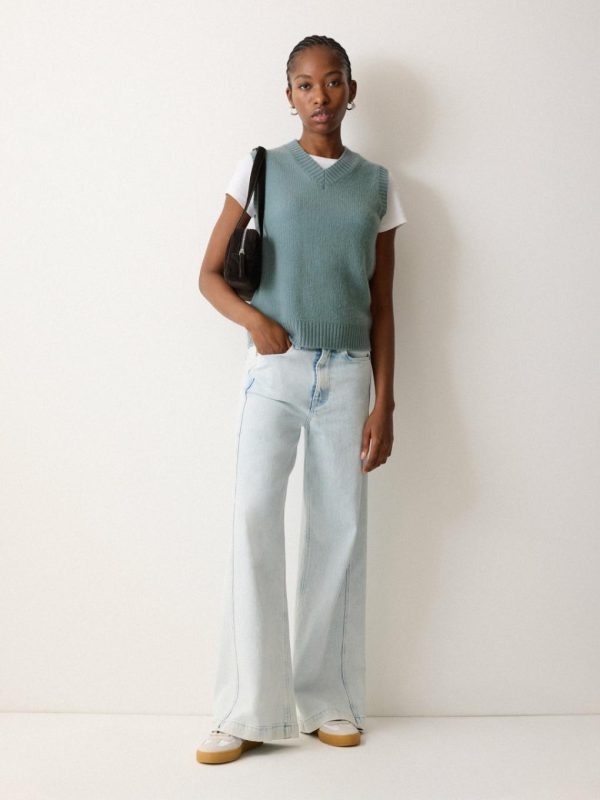 This sleeveless v-neck tank top is elevated with a mid-weight cashmere knitted yarn, making it the perfect transitional layer for the warmer months and beyond. Finished with modern chunky rib at the neck, hem and armholes, we love it paired with classic denim and a pair of statement shoes.