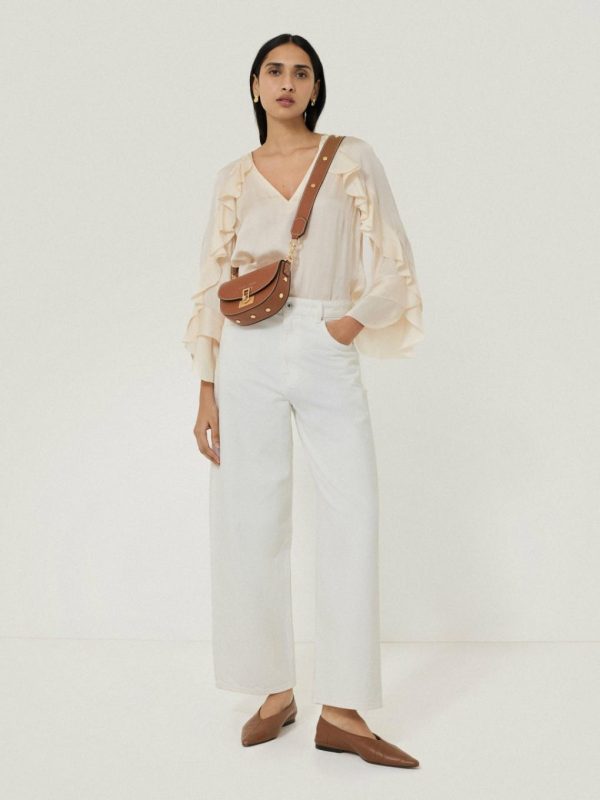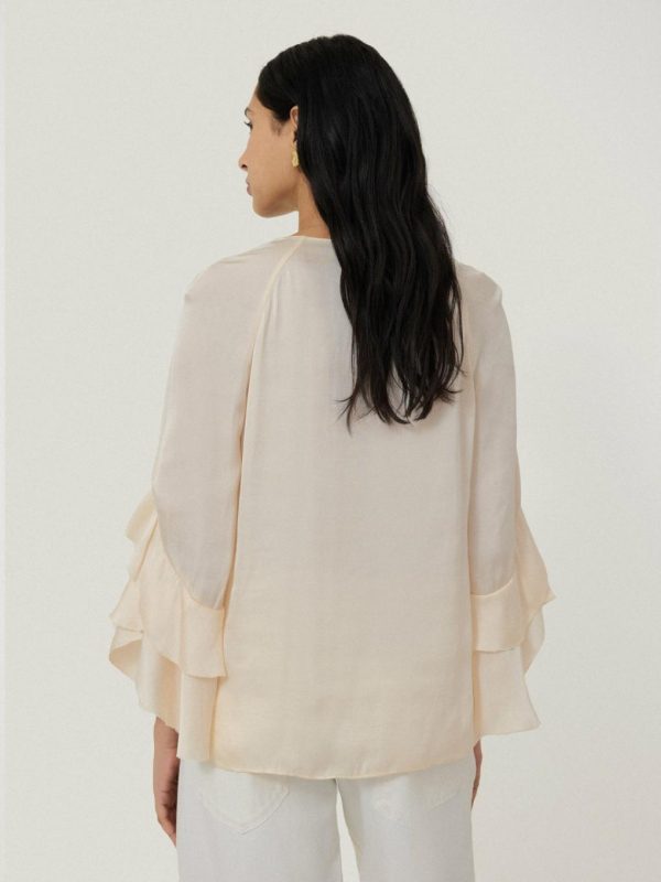 Evoking 70s-inspired romance, this top is dressed up with frills galore. Framing the neckline and sleeves, this beautiful detail brings movement, drapery and body to your evening look, while the recycled satin fabrication adds a lustrous finish.