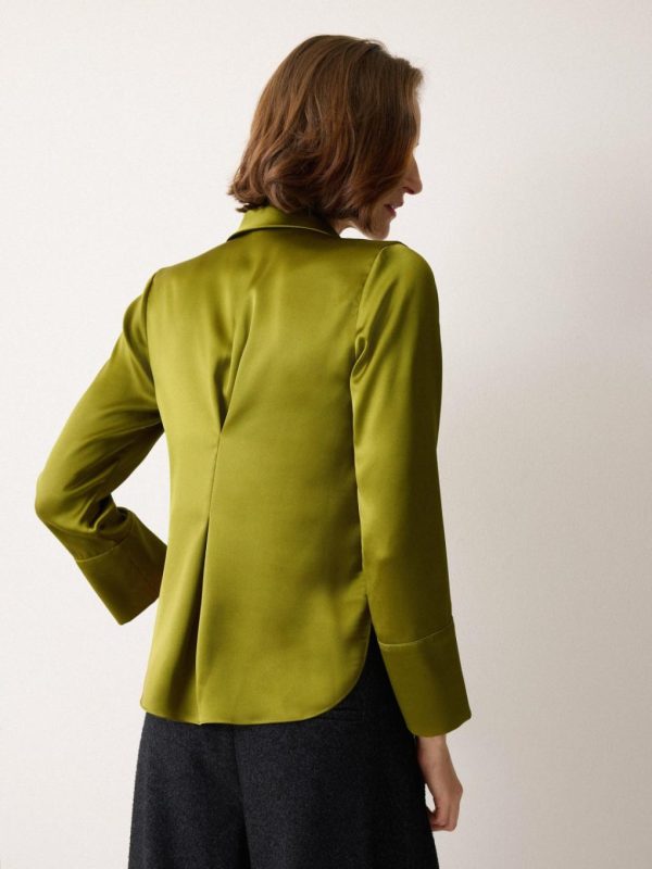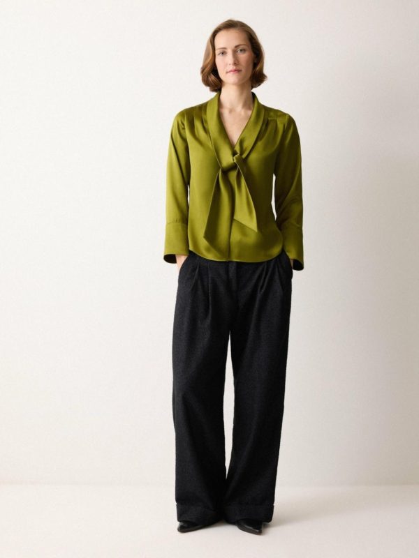 A new shape to bring to our satin drape collection, this long sleeve blouse makes for a sustainable evening option. Crafted from fluid recycled satin with a lustrous sheen, it boasts a bell shaped cuffs and neck detail for beautiful drapery.