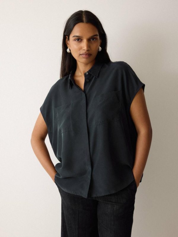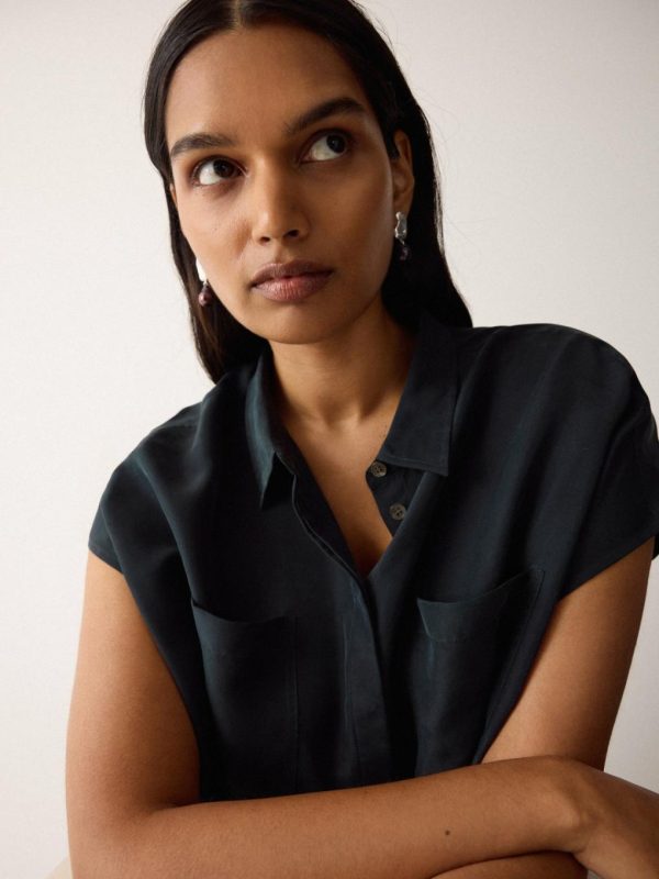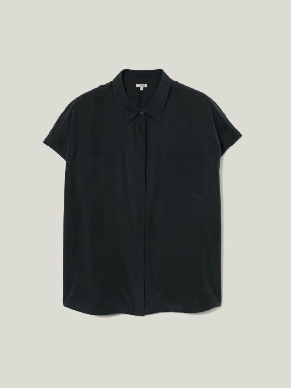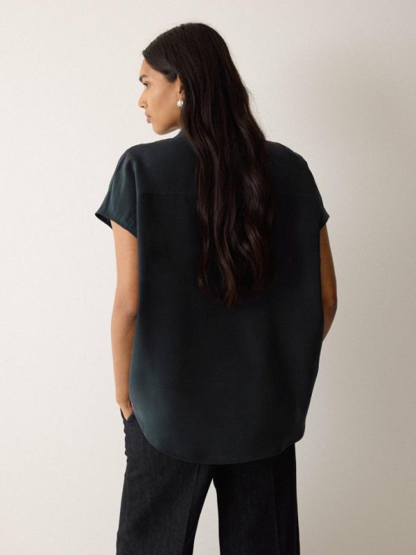 Perfect for day or night wear, this button down shirt is detailed with a curved back hem for refined coverage and short capped sleeves that beautifully frame the arms. Chosen for its fluid silhouette and effortless drape, the pure silk fabrication feels exceptionally soft against skin.