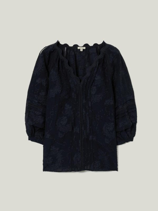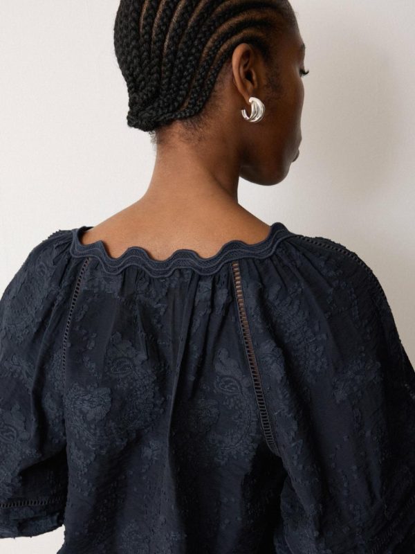 A summer blouse with endless versatility, this wardrobe piece combines volume with playful details. Crafted from a textured jacquard, exaggerated puff sleeves are detailed with beautiful pintucks, while a scallop trim lends a charming vintage-inspired feel.