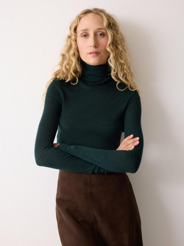 Knitted from pure merino wool, this subtly ribbed polo neck sweater is the perfect lightweight underpinning for the season ahead. It features long, slim sleeves with a turtle neck that can be worn, folded, unfolded or scrunched up. Semi-sheer, layer under tailoring or dresses to cold-proof your outfit or add a pop of interest.