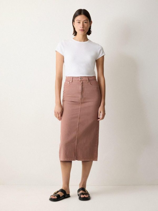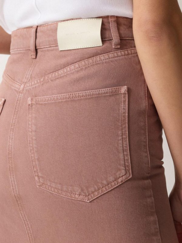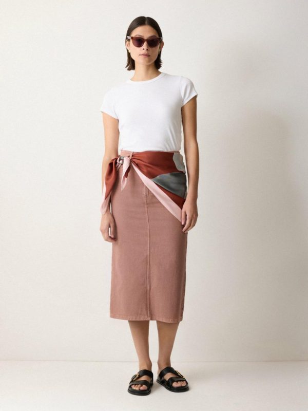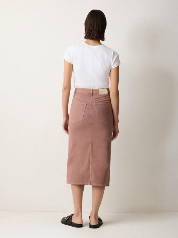 The soft pink hue of our Cole denim midi skirt is achieved by a unique snow washing technique. This sustainable process uses ozone machines and artificial stones that can be reused, and air cleaning as opposed to bleaching. This gives each piece of denim a unique, mottled effect. Dissolvable threads leave behind beautiful dye detail to the raw hem for a love-worn look.