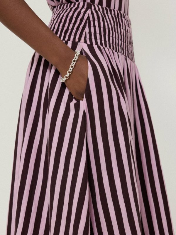 Designed as part of a playful summer two-piece, this midi skirt in cotton slub jersey is enlivened with a bold ticking stripe in key colours for the season; lilac and oxblood. A wide shirred waistband adds extra comfort which can be worn low on the waist or higher depending.