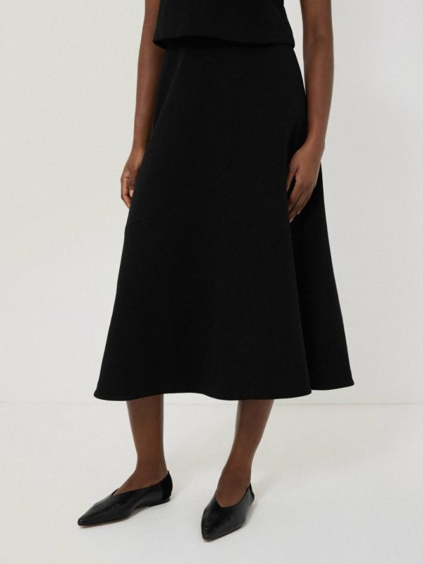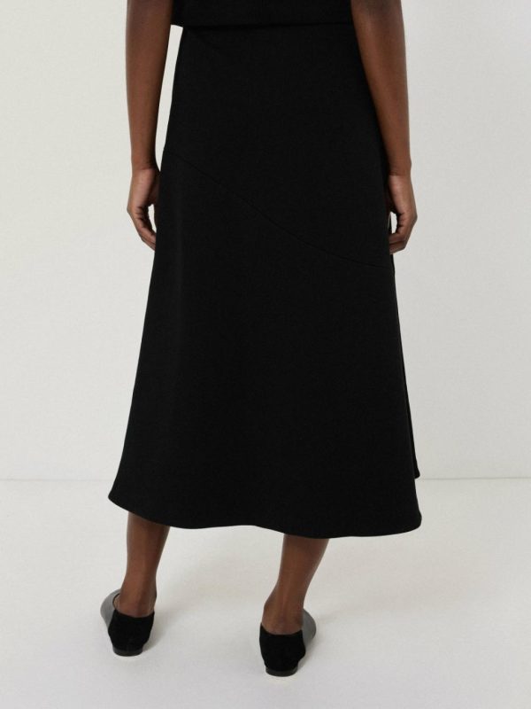 Designed as part of a co-ord, this black midi skirt has been crafted from a mid-weight crepe ponte jersey to give structure and a more dramatic silhouette. Finished with asymmetric seam detail, wear with the matching top for easy elegance during the summertime or mix and match with other pieces in your wardrobe.