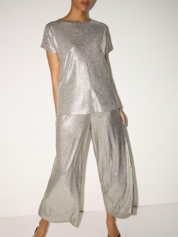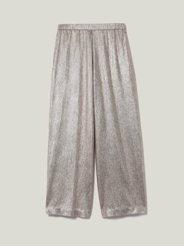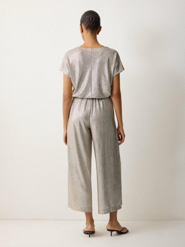 Shimmer during golden hour in these cropped palazzo trousers. Designed as part of a co-ord, the comfortable jersey design features a comfortable elasticated waist that can be worn low or high on the hip for a more relaxed look. Match with the top for head-to-toe shine.