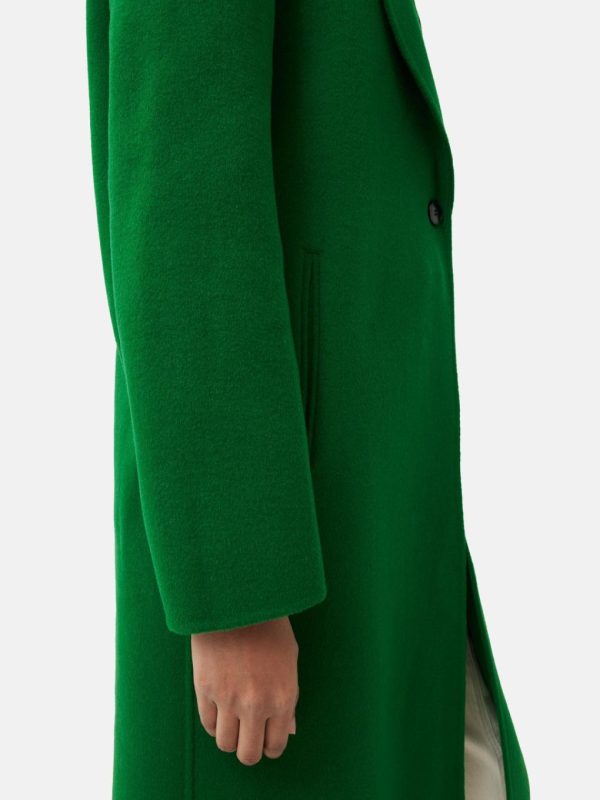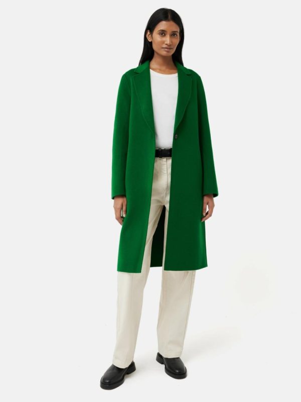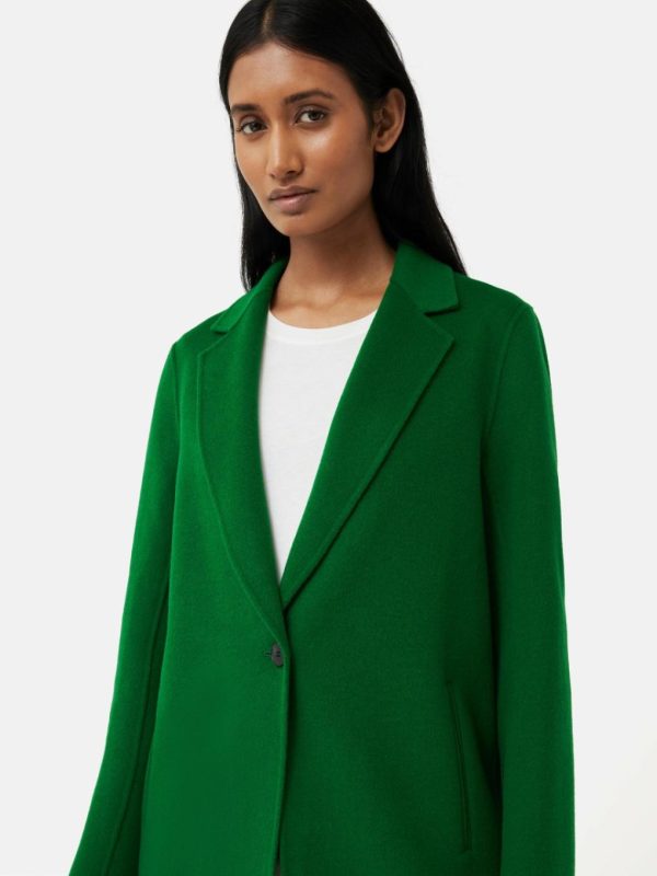 Luxury double faced coat with a single horn button front fastening. Our double-faced style is constructed by sewing two pieces of the same cloth together with invisible internal threads, making it look like one piece. It is a highly technical, time consuming and intricate process. Created in house, we have cut our pattern into an easy-fitting style with a notch lapel collar, side pockets and roomy sleeves to allow this seasons knits to fit underneath. This style is unlined as is made using an authentic double face construction.Fit and Features