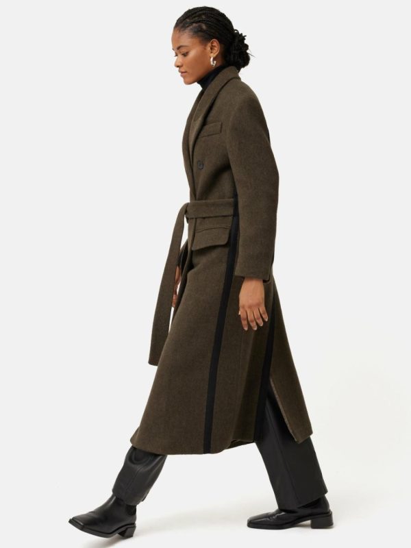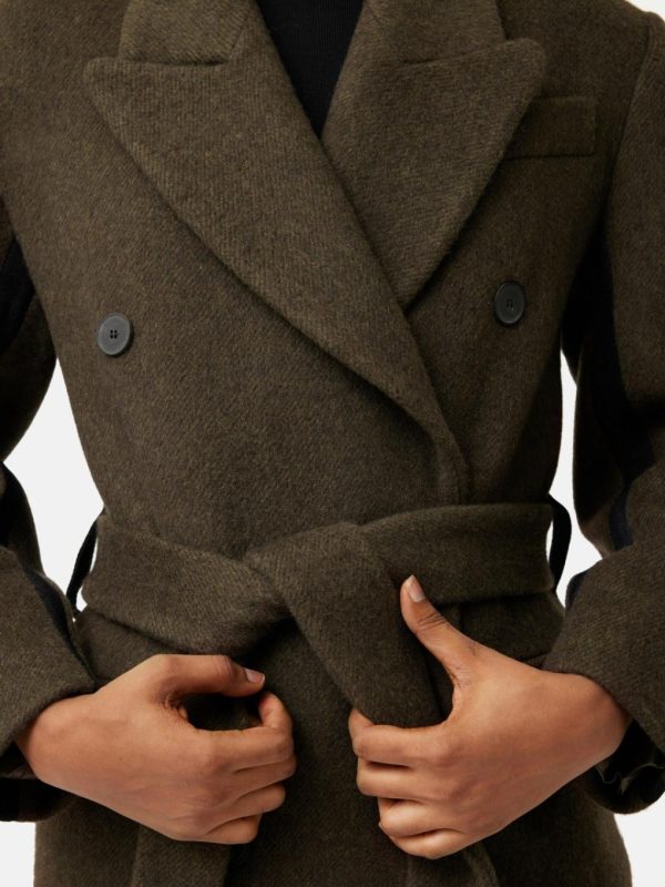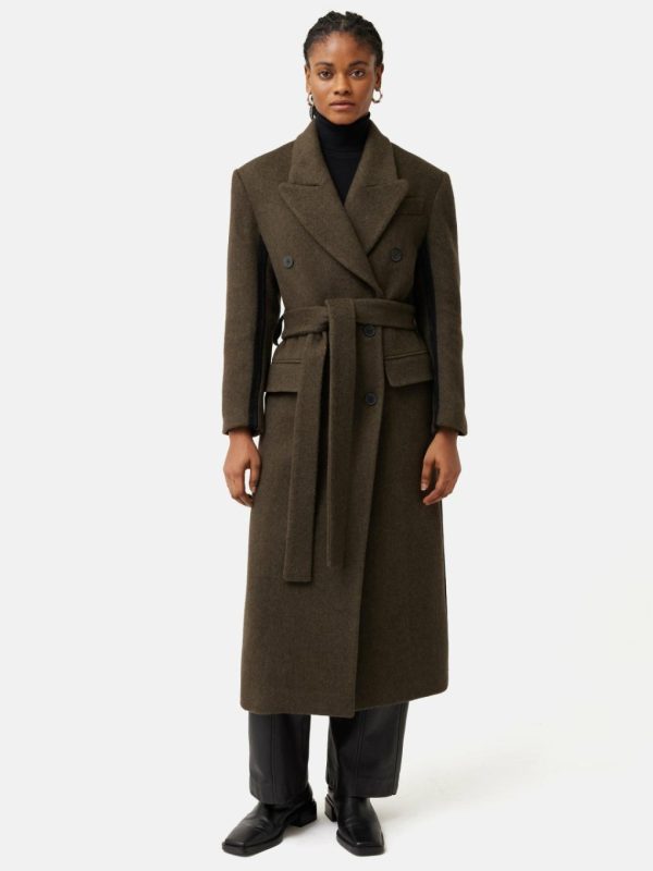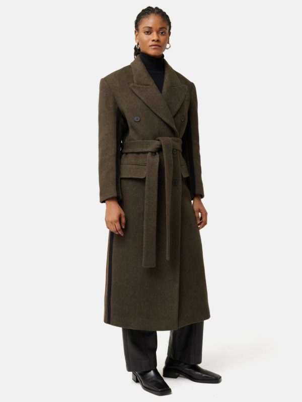The ultimate heritage coat, patterned in-house this double-breasted silhouette is intentionally wider at the shoulders for an oversized look. Cut in a pure wool twill from Italian heritage mill, Manteco, with contrast stripes down the sides, sleeves and centre back. Front flap pockets, single chest pocket and a detachable waist belt which enables you to cinch the waist in for a slimmer silhouette. Horn button double breasted fastening, fully lined with contrast melton undercollar and single back vent at the hem. For a neater fit, size down once from your normal size.Fit and Features